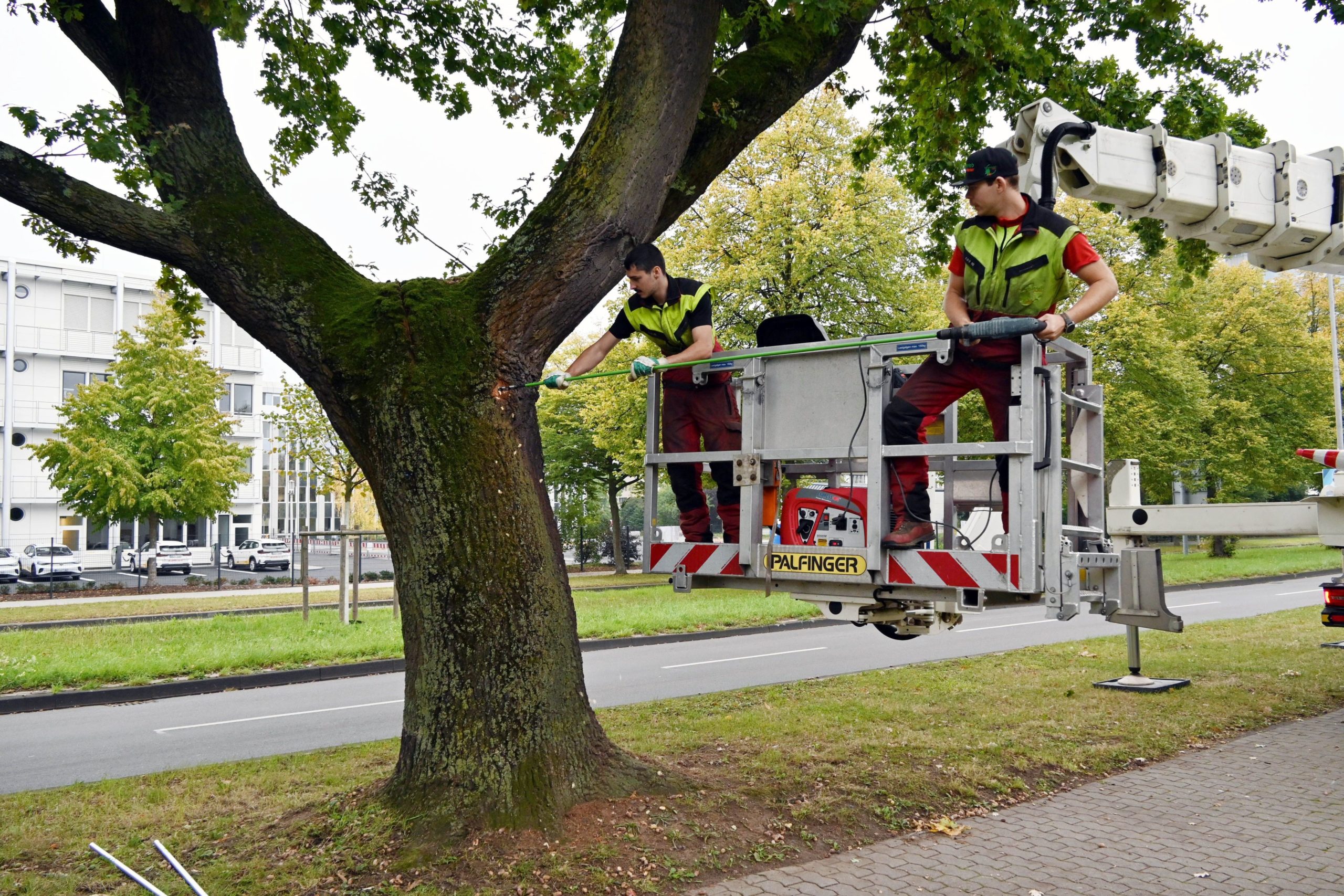 Die Hänge-Stieleiche (botanisch: Quercus robur ‚Pendula‘) steht direkt an der Ecke Rauentalshöhe/Schlachthofstraße, unmittelbar neben der Fahrbahn. Um die Verkehrssicherheit weiterhin zu gewährleisten, sorgt nun eine sogenannte Verbolzung dafür, dass der Baum standsicher bleibt.