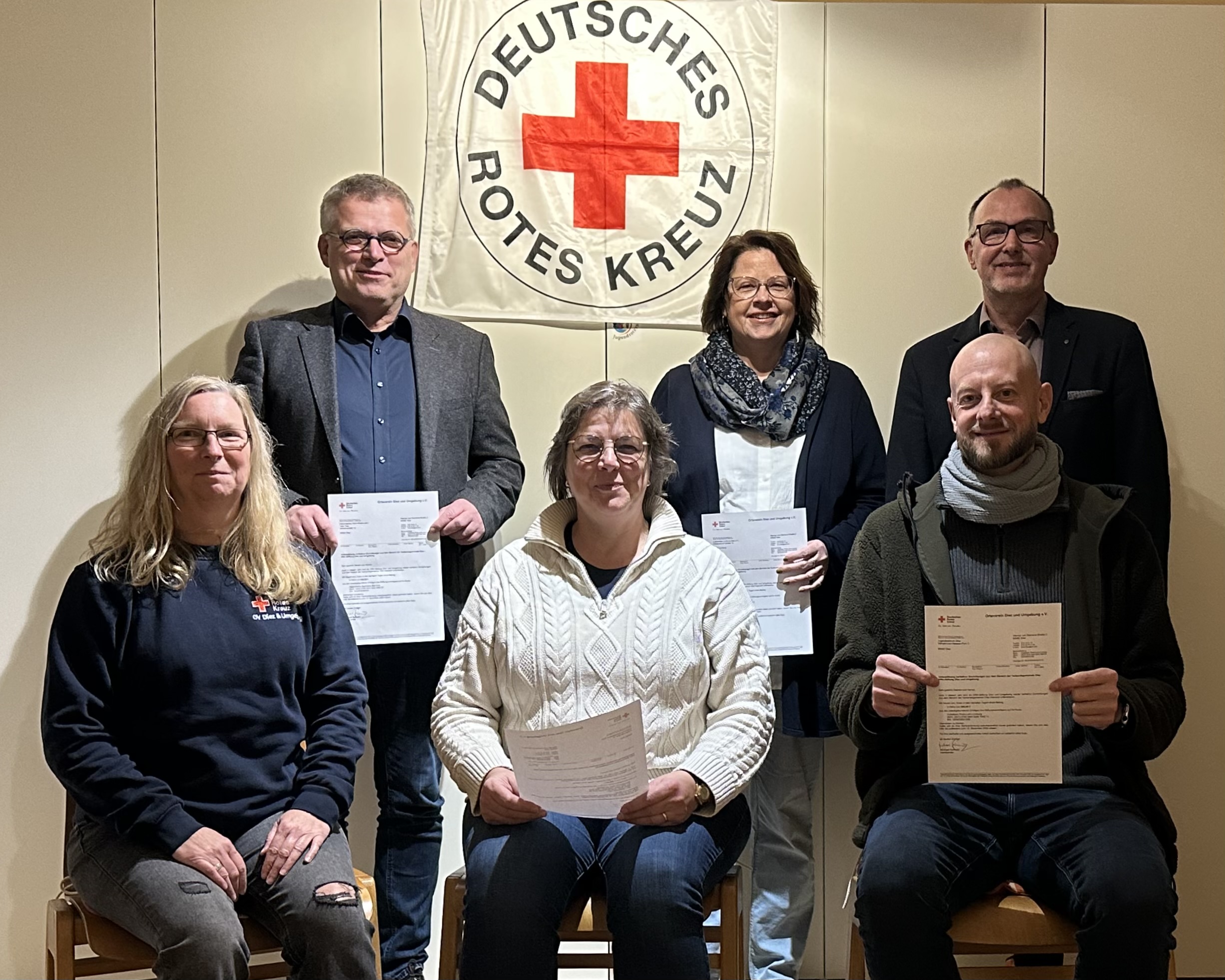 Landrat Frank Puchtler, Erwin und Irene Voll, Ortsbürgermeister Hans Wilhelm Lippert und der Bürgermeister der Verbandsgemeinde Diez Michael Schnatz bei der Überreichung der Ehrennadel des Landes Rheinland-Pfalz