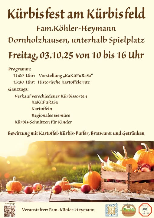 Bis dahin kann man sich immerhin die Zeit vertreiben. Ab 10 Uhr ist das Kürbisfest in Dornholzhausen eröffnet, mit allem, was das Herz begehrt. Bratwürstchen, Kartoffel-Kürbis-Puffer und Apfelsaft für die Kleinen. Für die Großen gibt es die bewährte Verfeinerung mit Amaretto oder Aperol, schließlich soll auch das Warten auf Kaküpurasa angenehm sein.