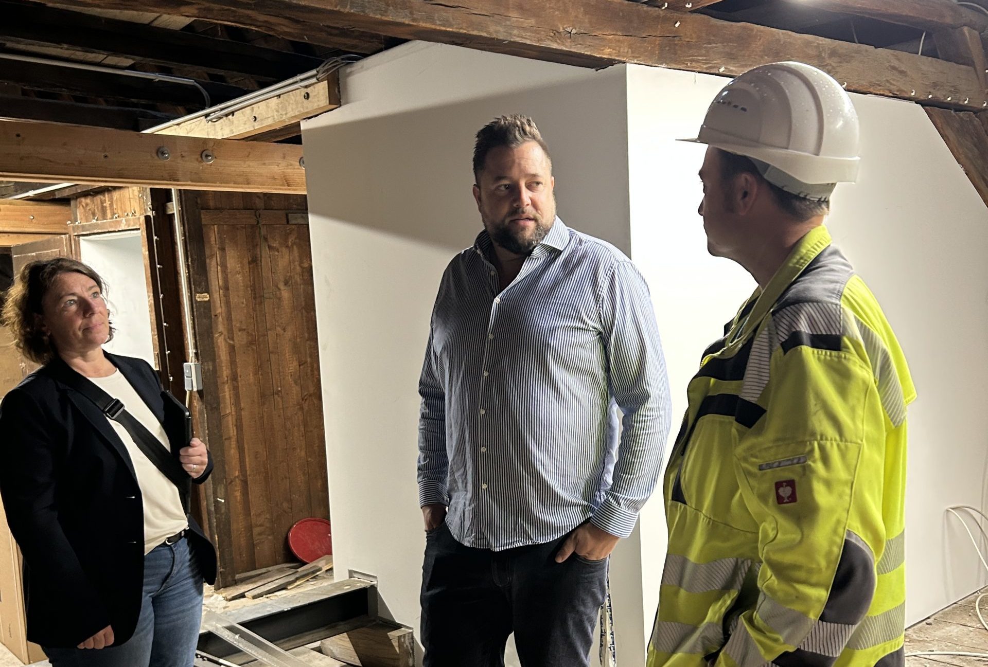 Auch am historischen Hauptgebäude selbst sind die Fortschritte deutlich sichtbar: Die Dachdeckerarbeiten sind abgeschlossen, das Alte Rathaus schmückt nun wieder ein hochwertiges Naturschieferdach.