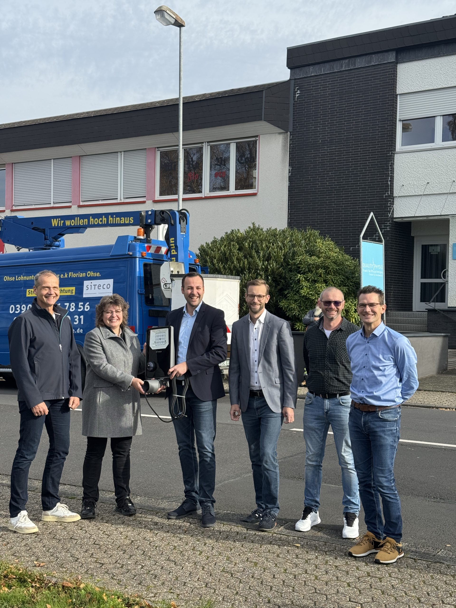 Zur Montage der ersten LED-Leuchte trafen sich in Montabaur die Projektbeteiligten (v.l.) Jens-Uwe Moses (Siteco), Stadtbürgermeisterin Melanie Leicher, Bejtus Berisa (Siteco), Bürgermeister Ulrich Richter-Hopprich und die beiden VG-Projektleiter Rafael Platzek und Kay Bröhl.