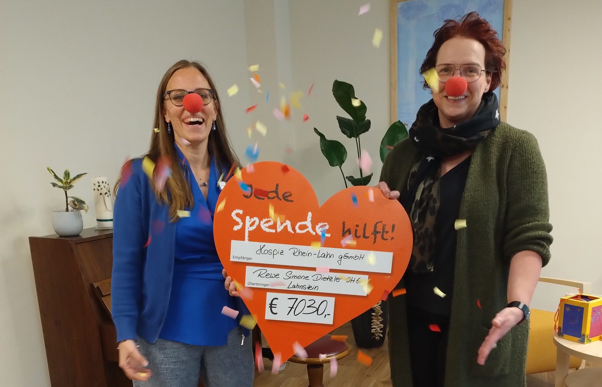 Bei der Spendenübergabe am 11.11. mit roter Nase und Konfetti: Hospizleiterin Hanne Benz(l.) und Simone Dietzler vom Lahnsteiner Rewe-Markt.
