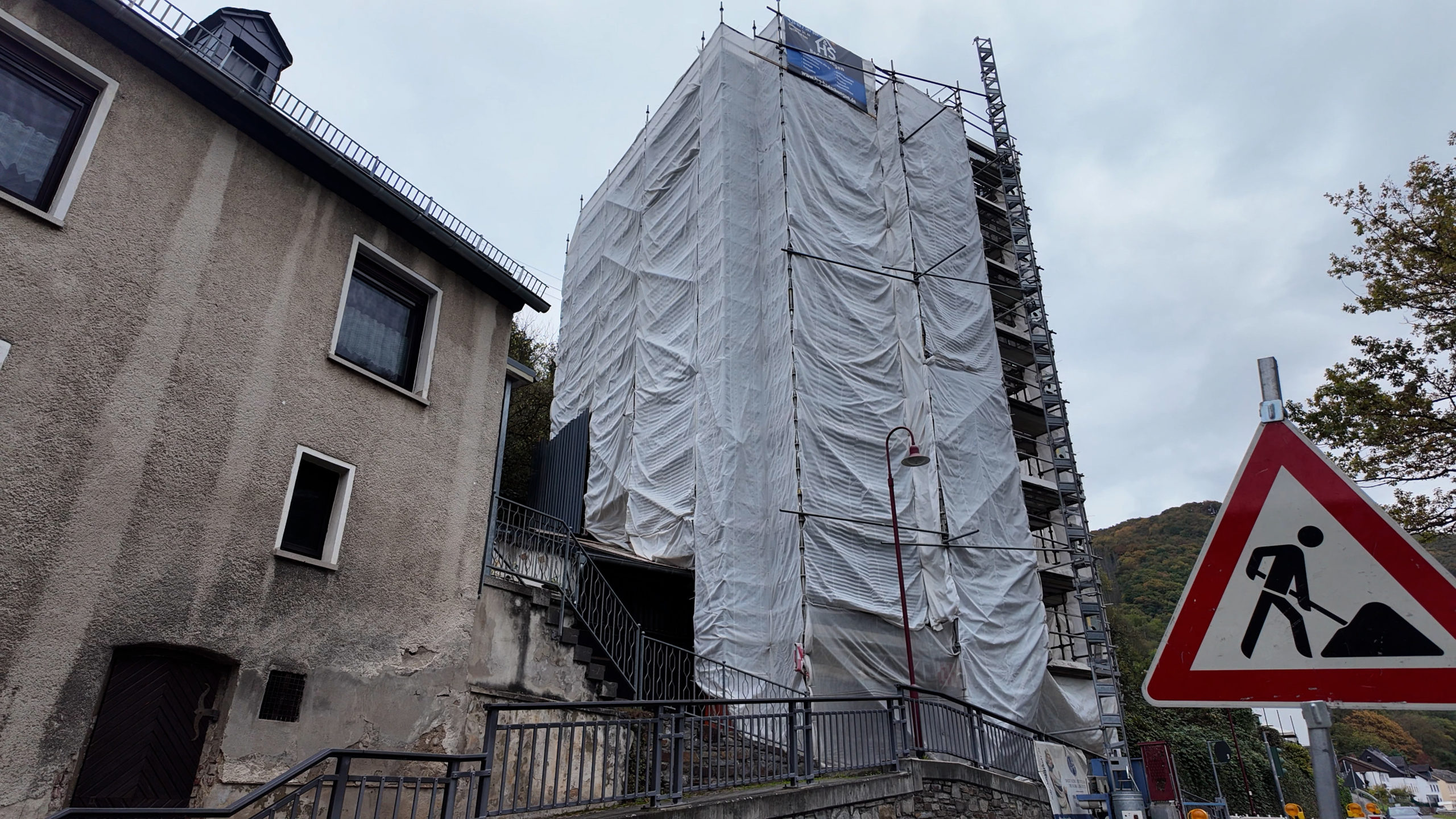 DAUSENAU Er ist das Wahrzeichen von Dausenau, er ist berühmt und er steht schiefer als mancher Turm in Pisa. Der Schiefe Turm von Dausenau ist seit Monaten hinter Gerüsten und Planen verborgen. Fast wirkt es, als hätte der Künstler Christo persönlich wieder Hand angelegt, so wie einst beim verhüllten Reichstag in Berlin im Jahr 1995. Auch hier sorgt die verhüllte Silhouette für Staunen und Neugier. Doch bald ist das vorbei. Die Sanierungsarbeiten neigen sich dem Ende und schon in Kürze soll das historische Bauwerk wieder frei sichtbar sein.