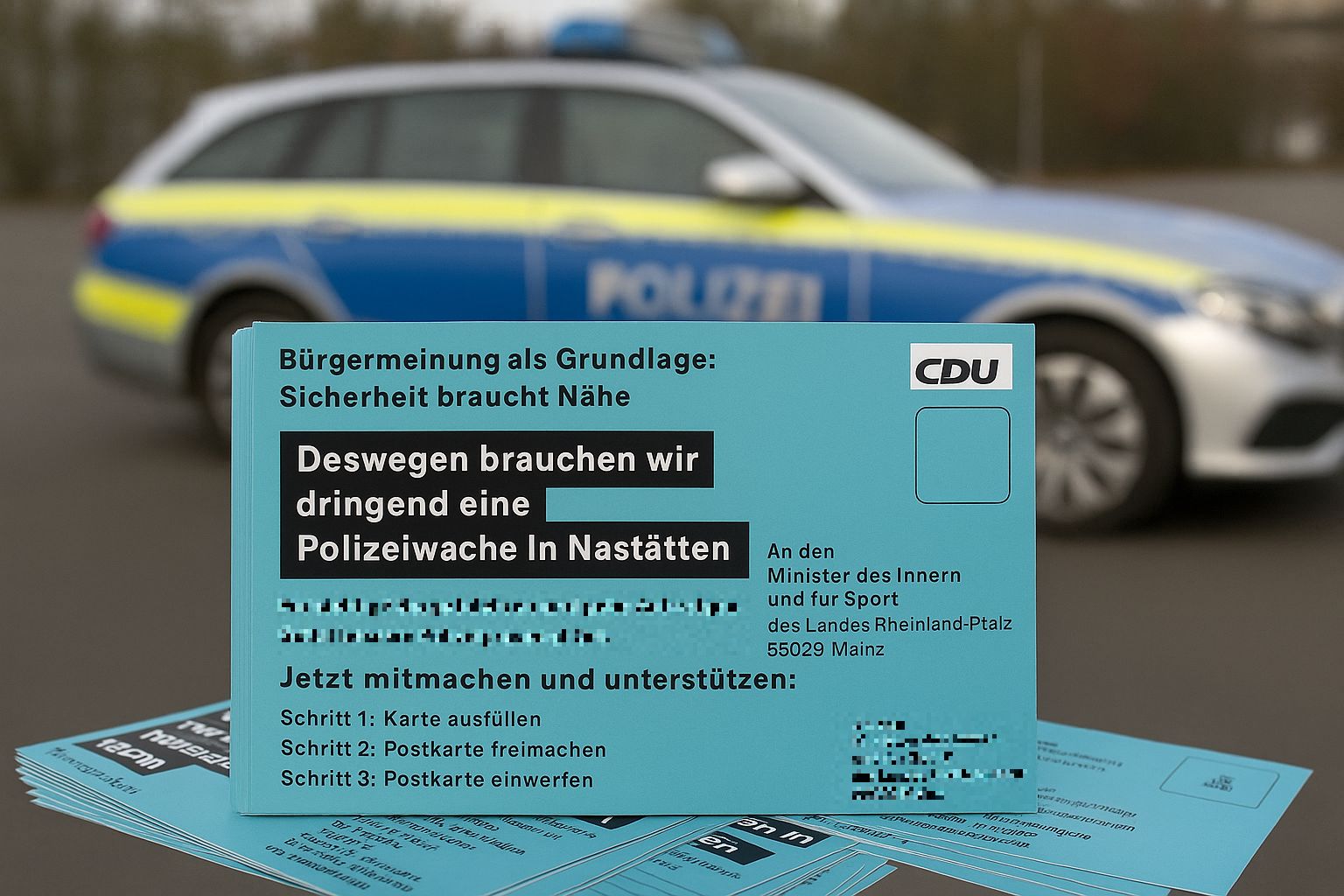 NASTÄTTEN Die CDU im Blauen Ländchen setzt sich mit Nachdruck für mehr Sicherheit in der Region ein und startet Ende November eine großangelegte Mitmach-Aktion zur Einrichtung einer zusätzlichen Polizeiwache in Nastätten. Unter dem Motto „Sicherheit braucht Nähe“ werden in der nächsten Woche über die Mitteilungsblätter Postkarten an alle Haushalte der Verbandsgemeinde verteilt. Diese sind direkt an den rheinland-pfälzischen Innenminister Ebling (SPD) adressiert und sollen den Wunsch der Bürgerinnen und Bürger nach einer besseren Polizeipräsenz deutlich machen. Hintergrund der Aktion ist die umfassende Bürgerbefragung der CDU im vergangenen Jahr. Dabei wurde klar: Ganz viele Menschen im Blauen Ländchen wünschen sich mehr sichtbare Einsatzkräfte und kürzere Reaktionszeiten. „Immer wieder wurde das Thema Sicherheit als zentrales Anliegen genannt. Hier wollen wir ansetzen und nachhaltige Verbesserungen bewirken“, betont Cedric Crecelius, Vorsitzender des CDU-Gemeindeverbands.