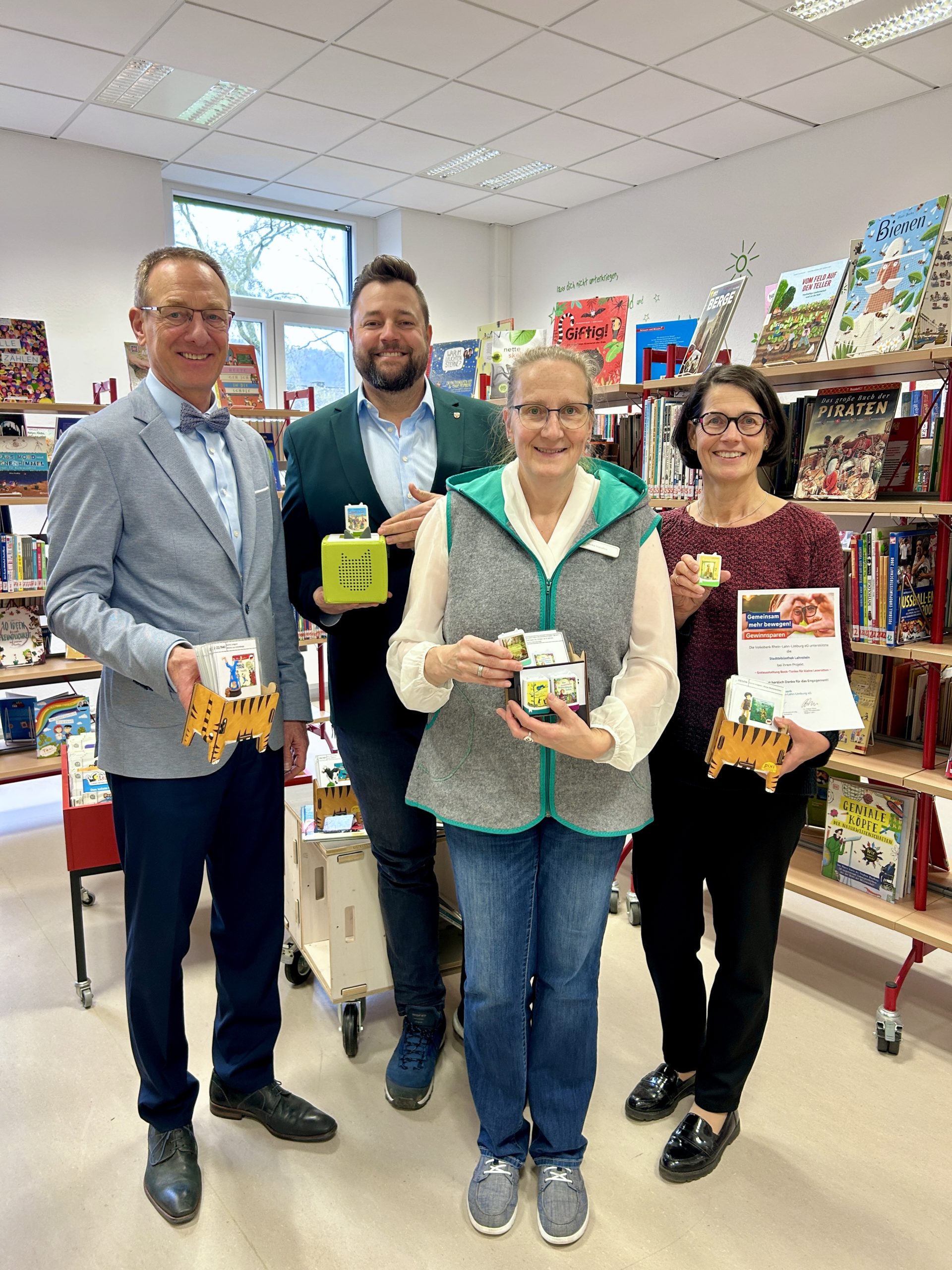 Book Tonies sind erst seit kurzer Zeit auf dem Markt. Die Stadtbücherei hat bereits alle 21 aktuell verfügbaren Ausgaben angeschafft, womit der Gesamtbestand an Tonies auf rund 320 wächst. Die Anschaffung wurde durch eine Spende der Volksbank Rhein Lahn Limburg in Höhe von 250,00 Euro ermöglicht. Bei der offiziellen Vorstellung war auch Bereichsleiter Günter Groß vor Ort. „Leseförderung beginnt oft schon mit dem Zuhören. Daher haben wir die Anschaffung der Book Tonies gerne unterstützt, um Kinder für Geschichten zu begeistern und ihre Freude am Lesen früh wecken.“