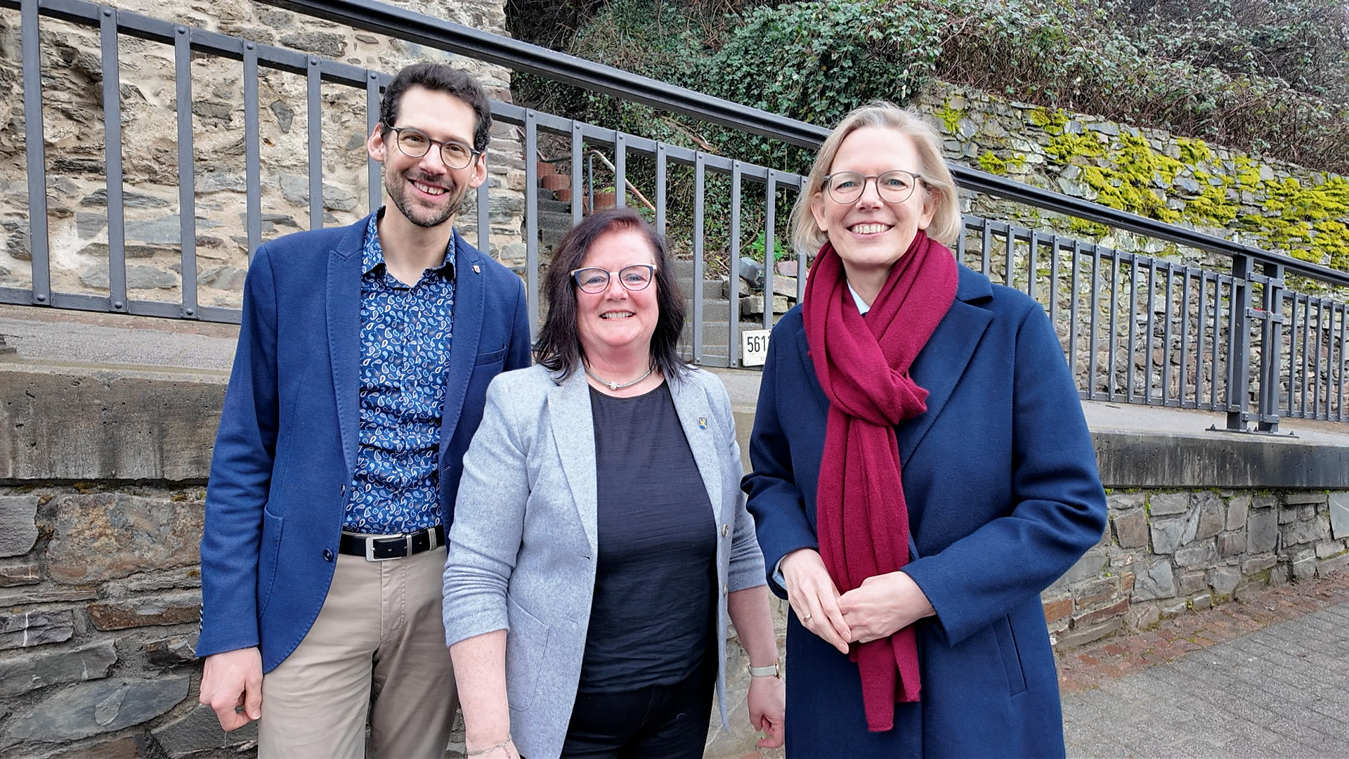 Sanierung am Schiefen Turm in Dausenau abgeschlossen. Große Freude beim Landtagsabgeordneten Manuel Liguori (links) Ortsbürgermeisterin Michelle Wittler (Mitte) und Staatssekretärin Simone Schneider