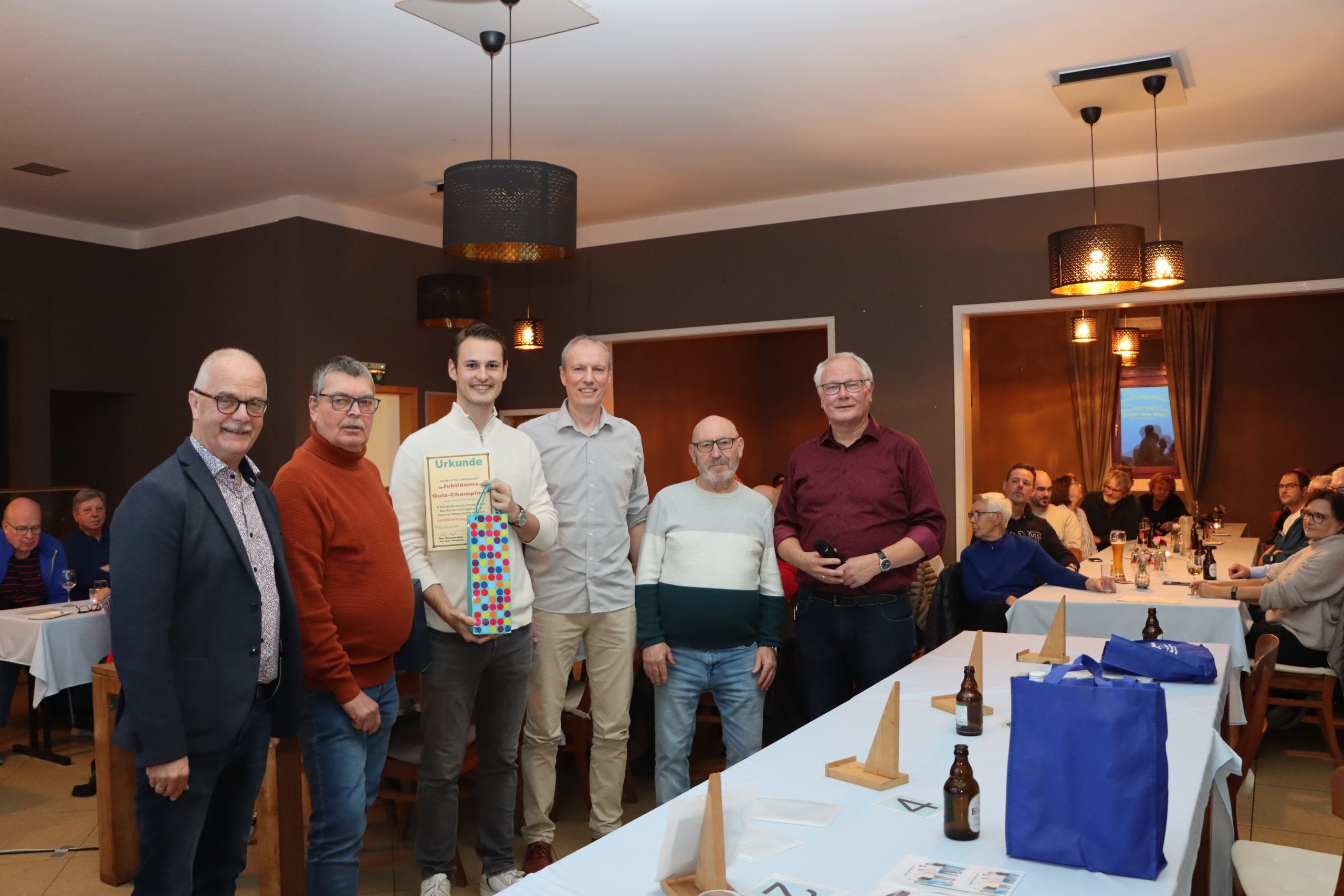 Alle Fragen handelten von Ereignissen, geschichtlichen Abhandlungen oder einfachem dörflichen Geschehen aus der Lahngemeinde, die auf einer Großbildleinwand von allen Besuchern gut mitzuverfolgen waren. Unterlegt waren die Quizfragen mit umfangreichem Bildmaterial aus dem Archiv von Jürgen Jachtenfuchs. Über 50 Besucher waren der Einladung gefolgt und gingen gebannt mit. Viele waren überrascht, wie viel Neues aus der Nieverner Geschichte sie selbst noch erfahren und mit nach Hause nehmen konnten. Nach dem Ergebnis der Schnellrunde und insgesamt 22 Fragen stand am Ende Philipp Lenz als „Jubiläums-Quiz-Champion“ fest und gewann die Siegprämie von 150,00 €. Die nachfolgenden Plätze belegten Egon Crezlius, Markus Münch und Hubert Crezelius.